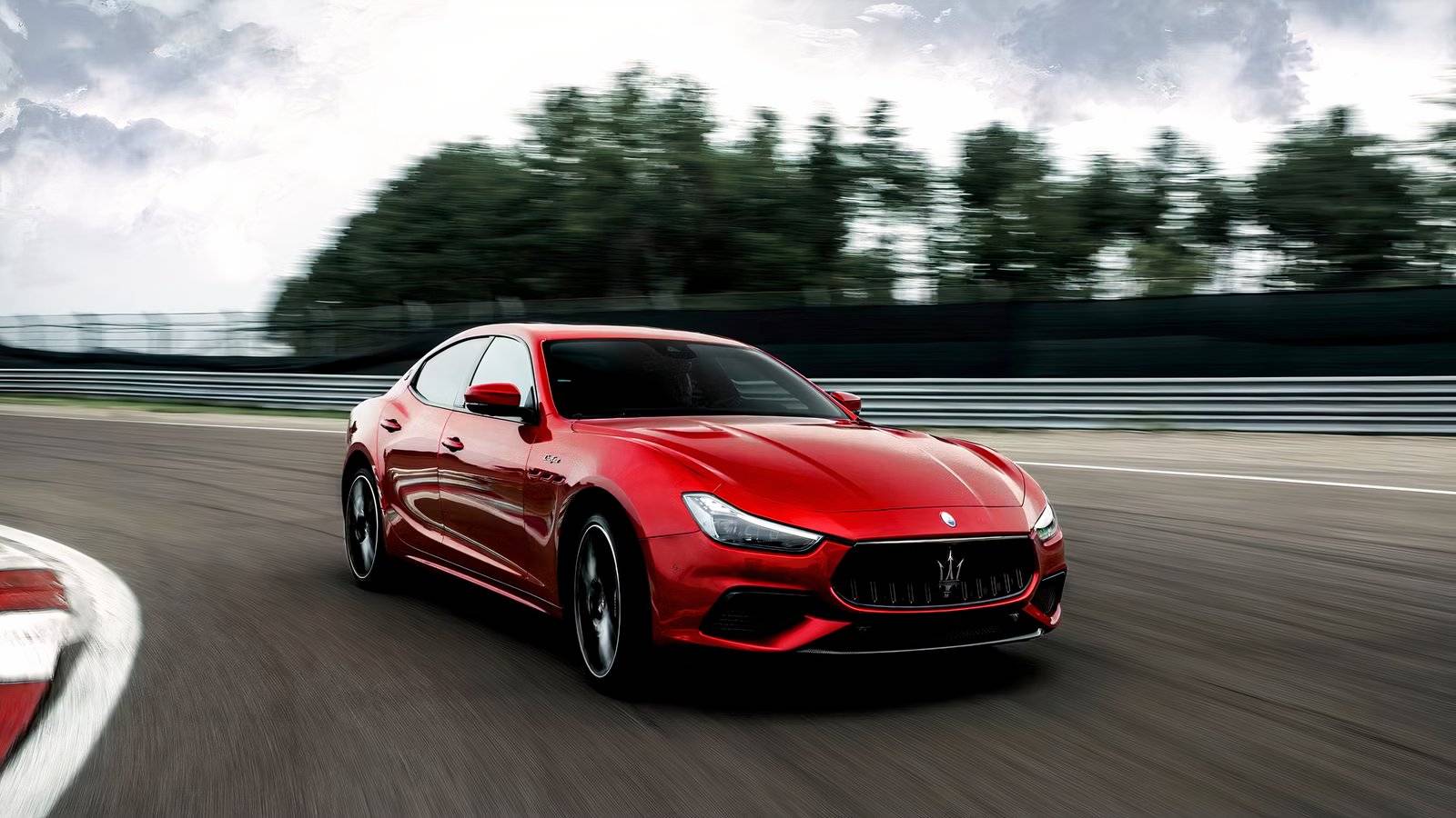 Front 3/4 shot of a red Maserati Ghibli Trofeo driving