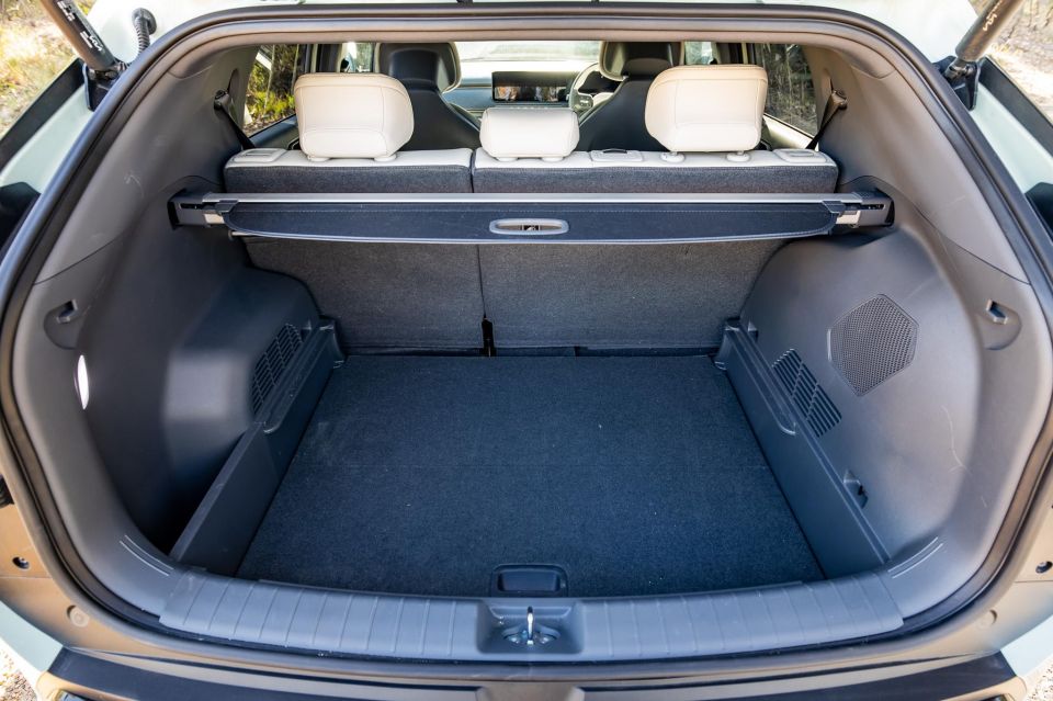 The frustrating thing is there’s room for a space-saver spare wheel, but you don’t get one. Just a tyre repair kit, and you’ll need to fit your charging cables in there and the standard V2L adapter, too, unless you put them in the boxed-off edge sections. There are shopping bag hooks and a cargo cover, too.