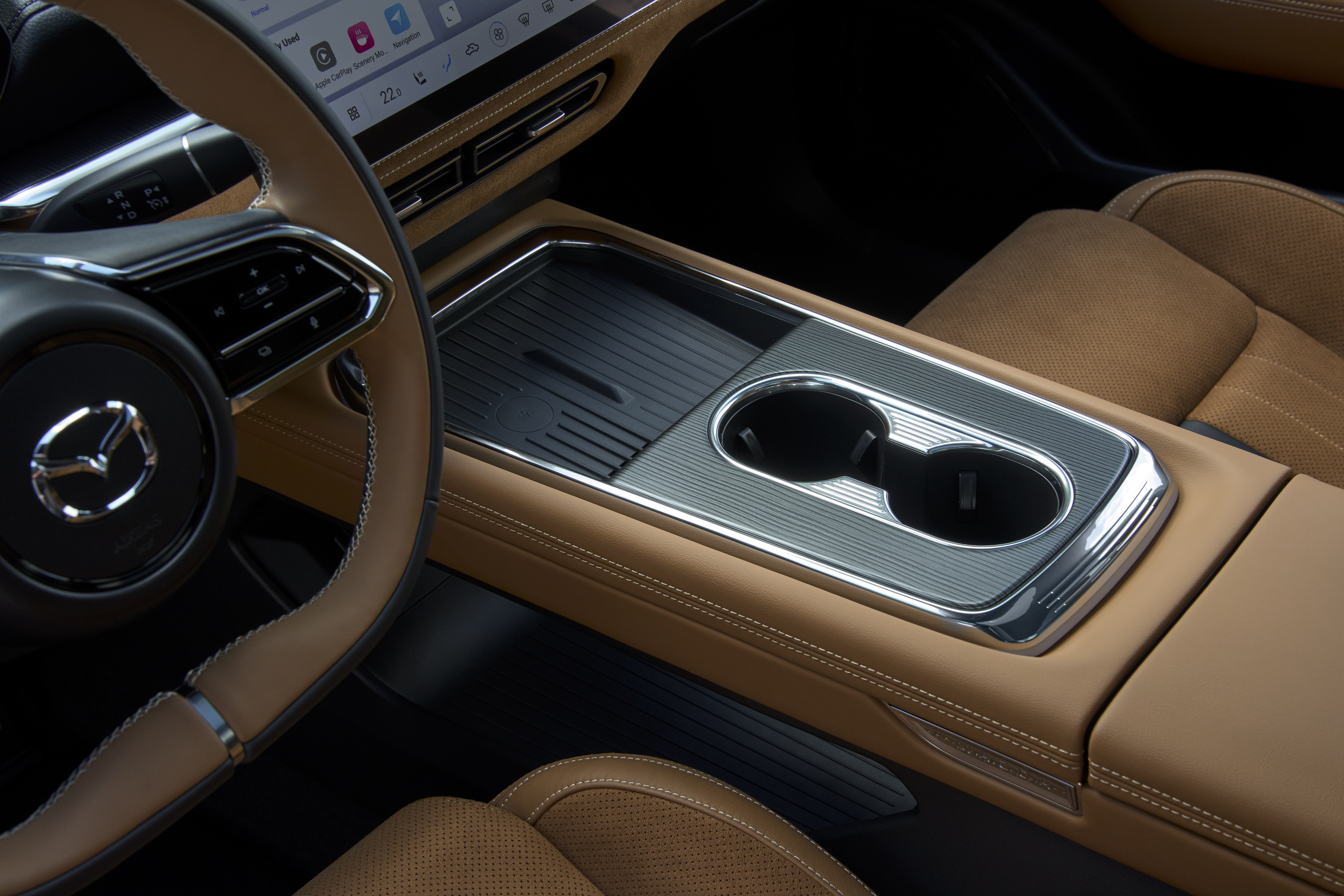 Below the screen is a wireless phone charger and there’s storage space between the front occupants with USB-C outlets. The central armrest is also wrapped in leather and opens to reveal another large storage bin.