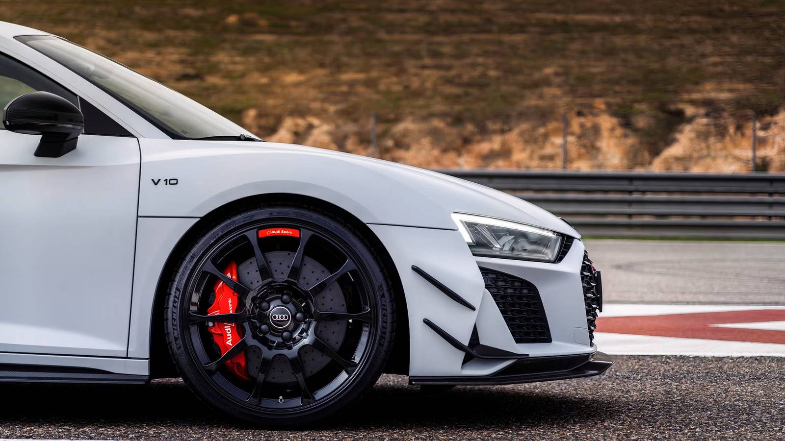 Side shot of a white 2023 Audi R8 GT parked on track
