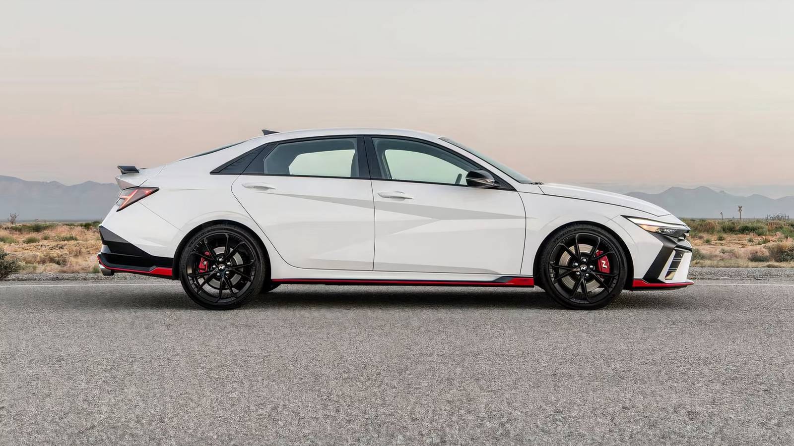 2025 Hyundai Elantra N in white driving on desert road