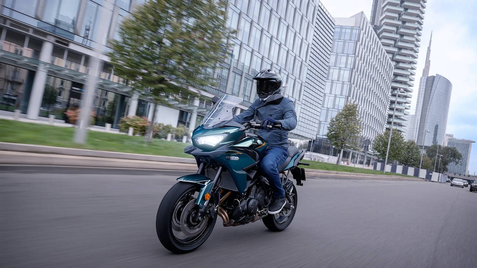 Beauty shot of the Kawasaki Versys 650 with rider