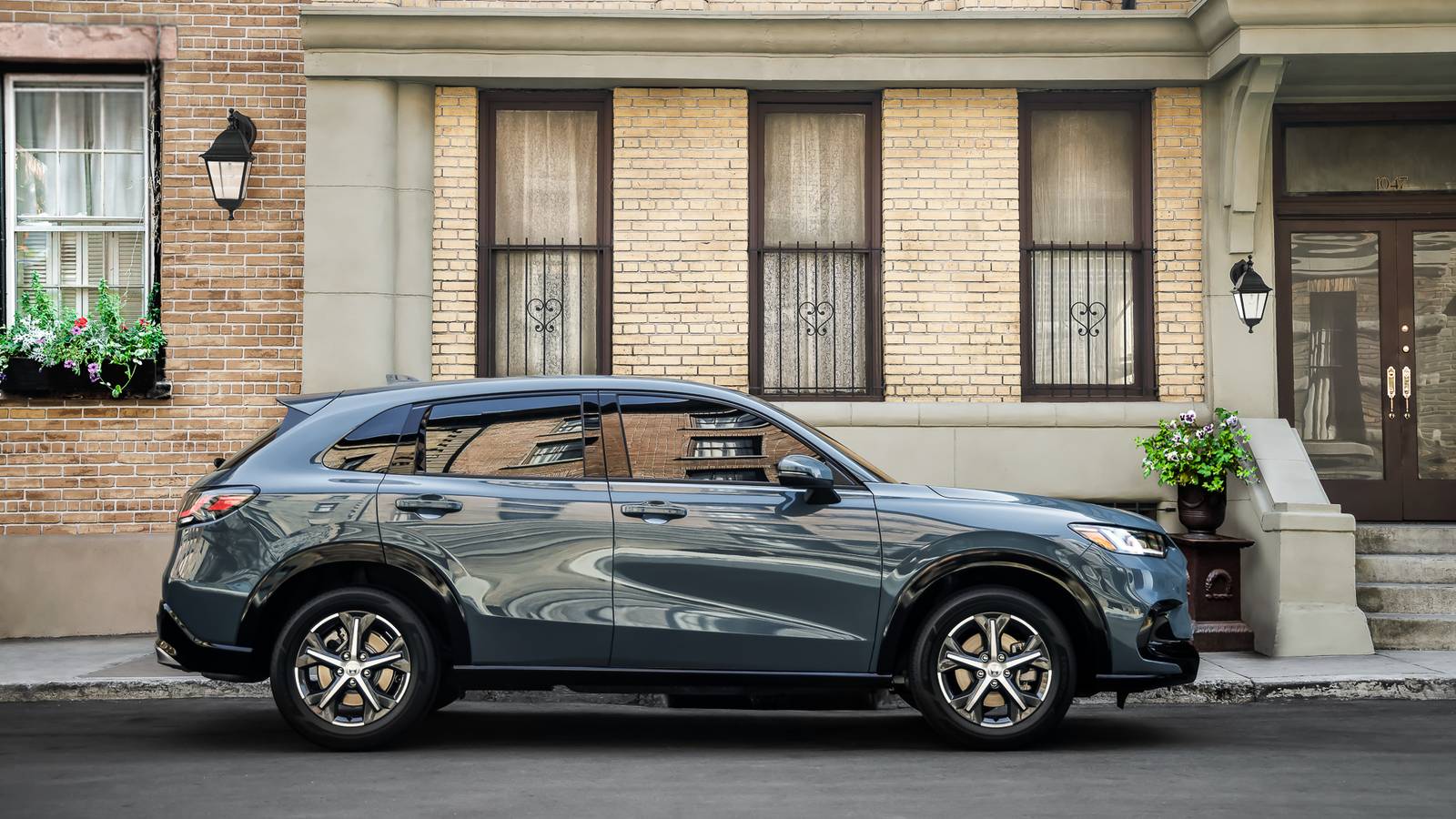 Front 3/4 shot of a gray 2024 Honda HR-V parked in front of a building
